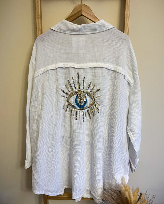 Sequin eye detail cheesecloth top in white